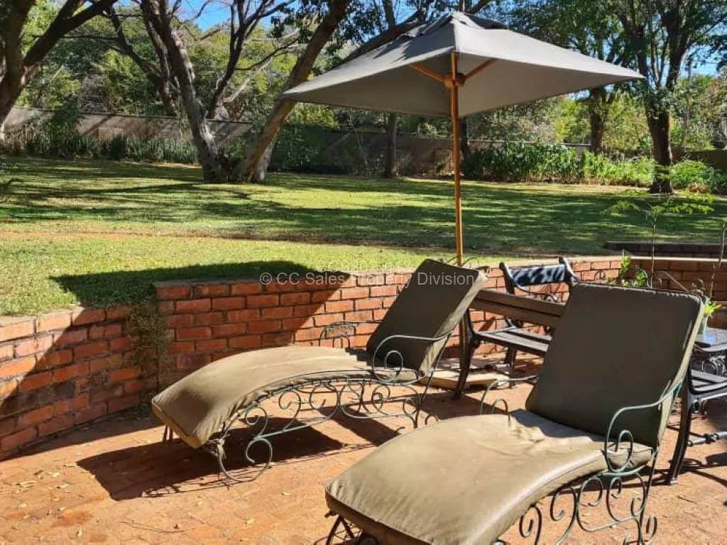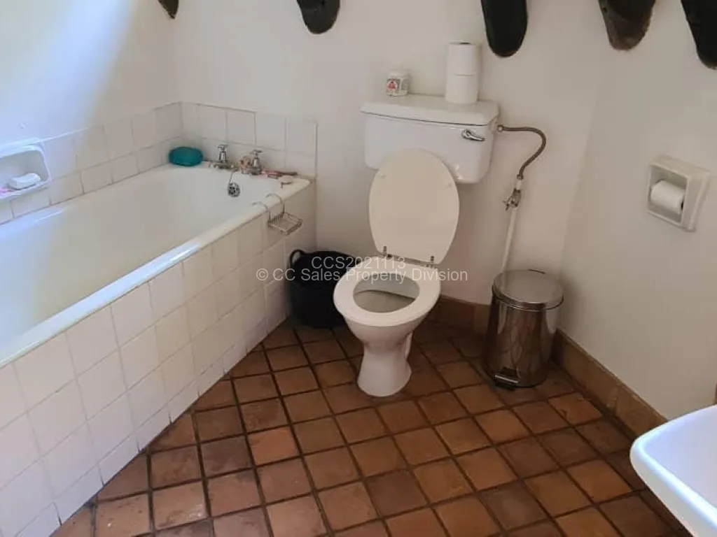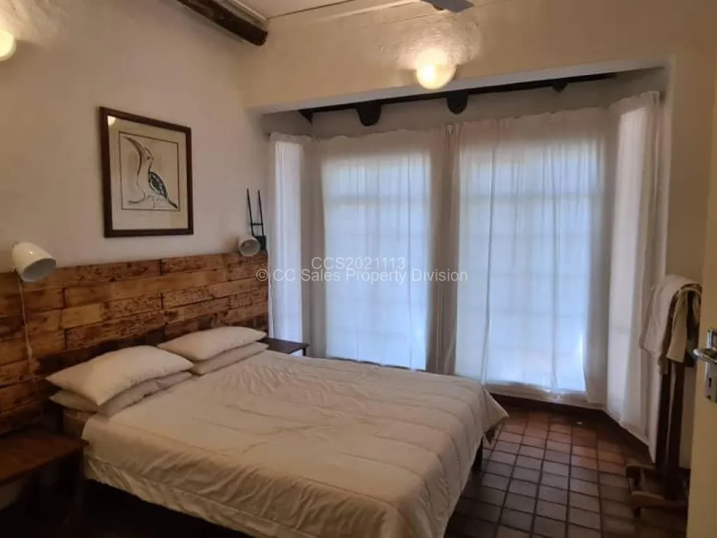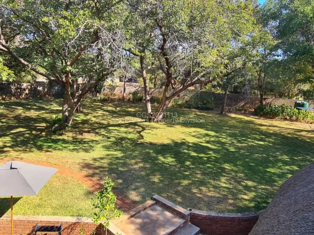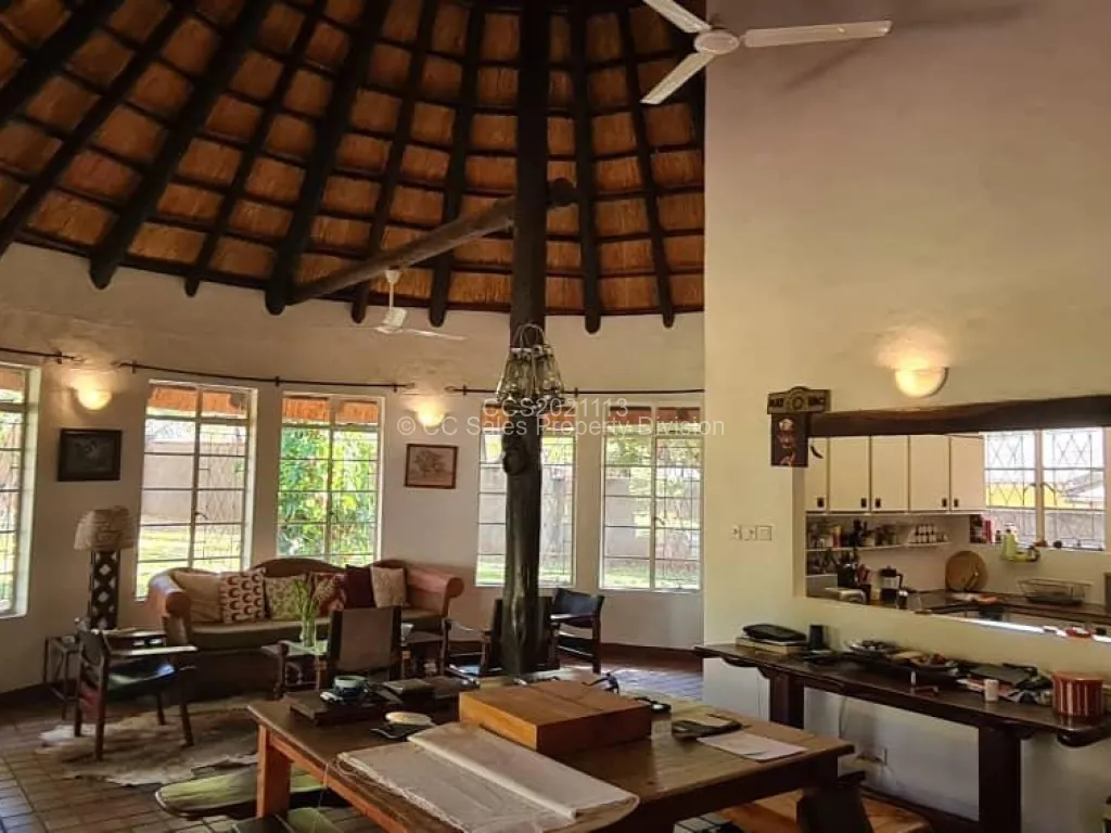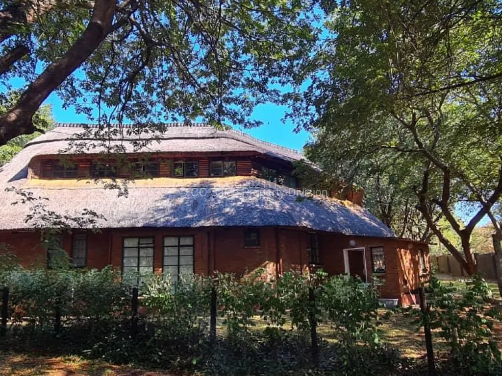 Beautiful brick under thatch home in the resort town of Victoria Falls sitting on 3278m2. Property consists of 3 bedrooms, 2 Bathrooms with an upstairs loft bedroom ensuite. Lovely fitted kitchen with open plan lounge and dining room. 1 bedroom studio style self-contained cottage. Outdoor laundry and storeroom and single staff quarters. This property has council and raw water connection with 2 x 5000Lt water tanks and water pump. It is walled with electric fence and gated with two entrances. Share transfer option available.